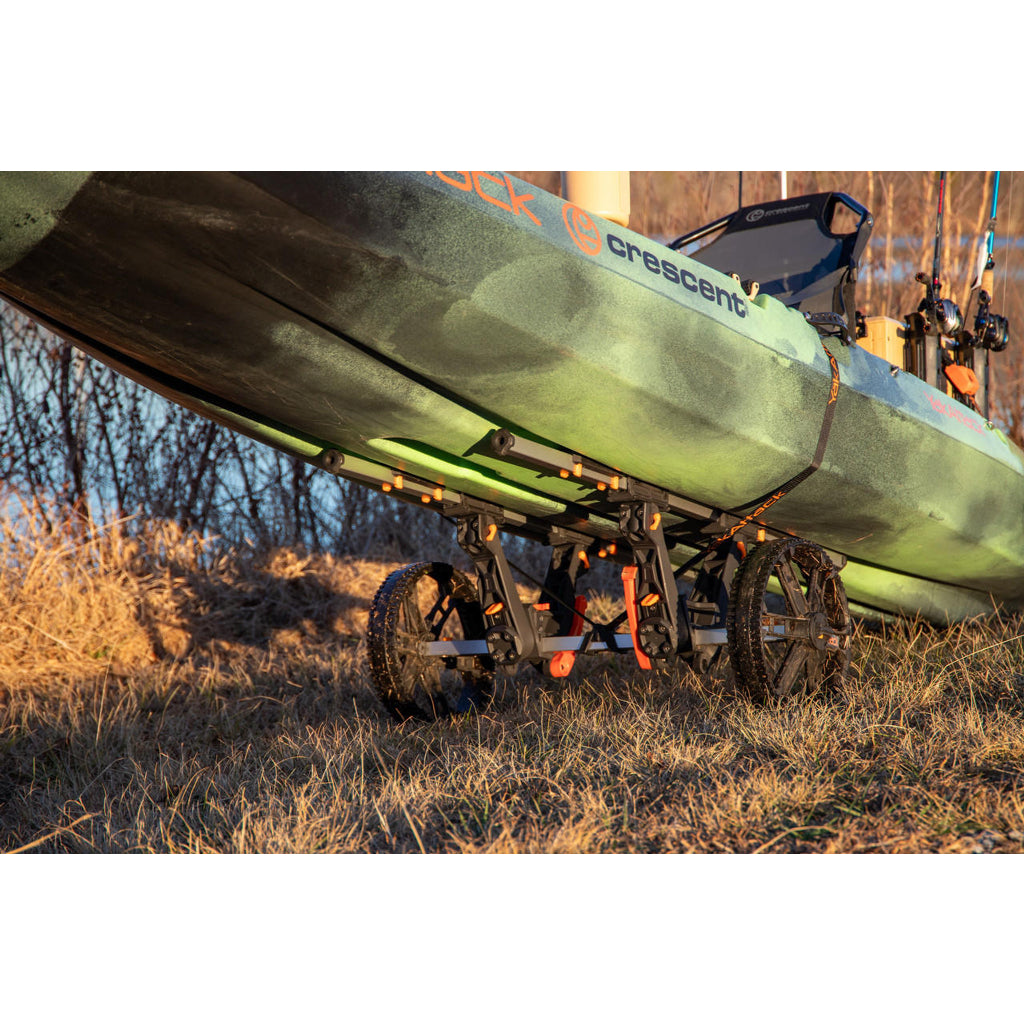 So, you’re at the launch, now what? Sometimes it’s not convenient to take your cart back to your vehicle, and doing so leaves your kayak and gear unattended and susceptible to theft. We solved this problem by making the BarCart ultra collapsible. The wheels can be removed with the push of a button. The bunk bars, long enough for even the widest fishing kayaks, collapse with a heavy-duty ferrule and bungee system, enabling them to go from a 44” deployed length to less than 18” in a compact and secure package. The uprights fold down, parallel with the axle, making it possible to store the BarCart inside the hull of a kayak. All of this can be performed with no tools using smart and simple buttons and levers. If needed, everything minus the centralized tiedown point can be removed from the aluminum axle.