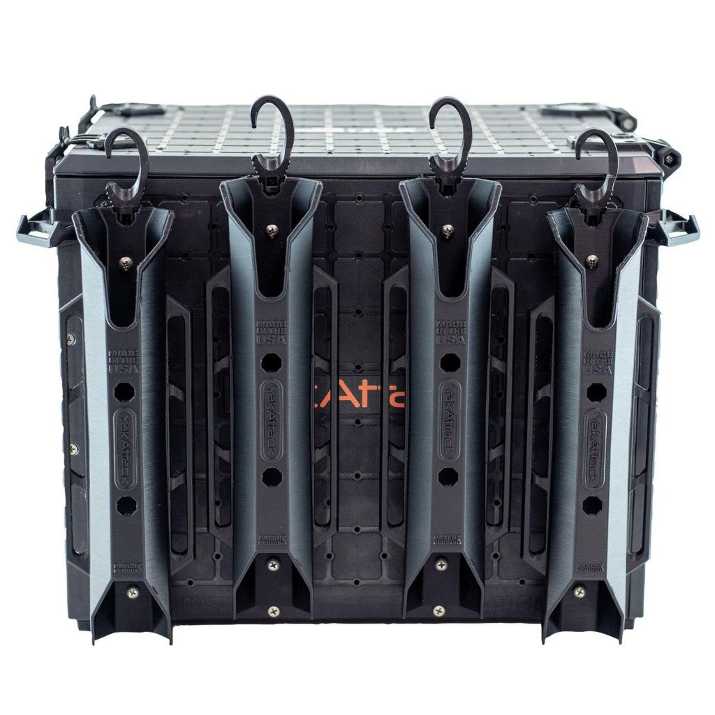 The included four TetherTube rod holders with integrated but easily removable hook and tether systems ensure your rods stay put if things go wrong. Caged attachment points on both sides of the tube offer multiple hook points, and the oversized hook design is sized to attach directly to the shaft of your fishing rod if desired. The TetherTube rod holder mounts to the GridLock panels using at least three of the four standoff pads, enabling several vertical positioning options. Mount them high for rods with long butts, or mount them low to elevate the BlackPak Pro into the HighNDry position. Additional TetherTubes are available for purchase as single and two packs.