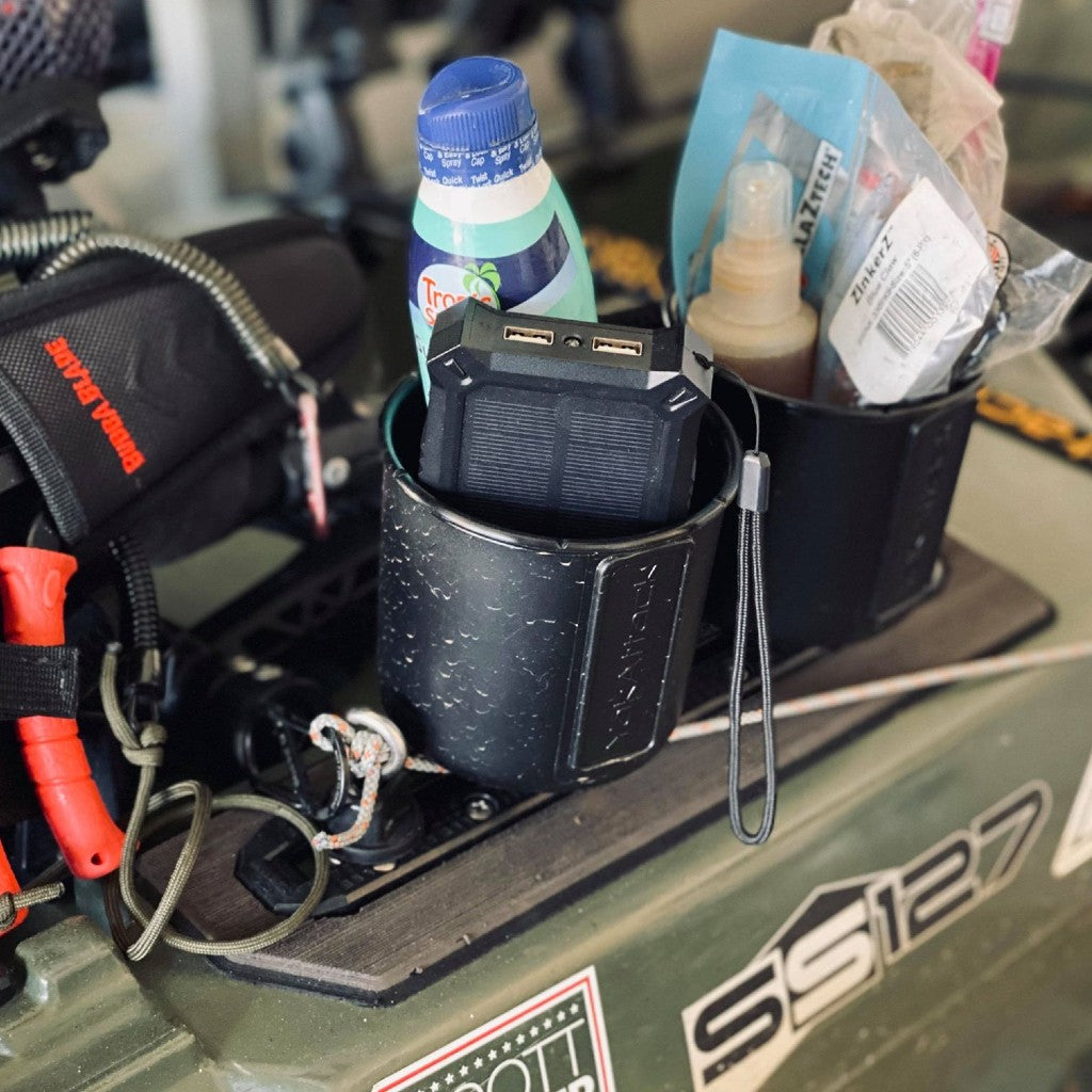 The YakAttack MultiMount Cup Holder quickly and easily attaches to most kayak track systems. Designed for maximum versatility, the MultiMount Cup Holder accepts anything from stainless steel tumblers to Nalgene® Bottles to 12 oz cans and water bottles. Not thirsty? The MultiMount Cup Holder also makes a great place to put small tools and other items! Made in the USA from premium materials for a lifetime of use in even the harshest environments. Compatible with YakAttack MightyMount’s, GearTrac, and most other kayak track systems from Scotty Fishing Products, RAM Mounts, and YakGear. For FeelFree Kayaks, 3 Water Kayaks, and Jonny Boats you will need an adapter to be compatible. We offer the needed adapter in a single pack (AAP-1012) and a six pack (AAP-1012-6).